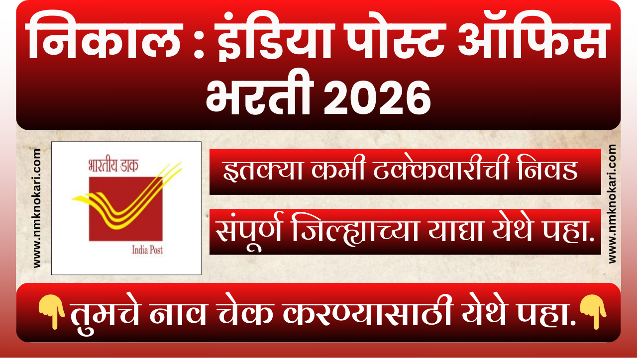 GDS Maharashtra Result 2026 : ग्रामीण डाक सेवक (GDS) अंतर्गत एकूण 22,000+ रिक्त पदांसाठी जाहिरात प्रकाशित करण्यात आली होती,आणि ज्या उमेदवारांनी अर्ज सादर केले होते त्यांना निकालाची प्रतीक्षा होती, त्यांच्या साठी आनंदाची बातमी आहे,कारण ग्रामीण डाक सेवक (GDS) द्वारे अंतिम फायनल यादी अधिकृत संकेतस्थळावर प्रकाशित करण्यात आली आहे. यादी मध्ये नाव असलेया उमेदवारांना 23 मार्च 2026 पर्यंत कागदपत्र पडताळणी साठी बोलाविण्यात आले आहे. यादी बघण्यासाठी खाली दिलेल्या लिंक वर क्लिक करा.